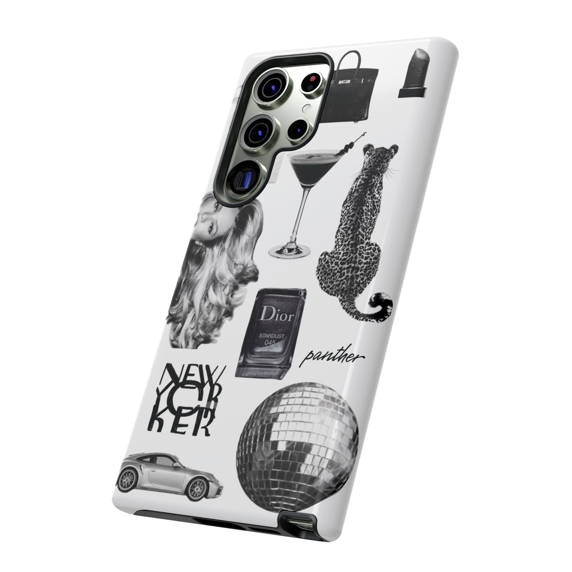 This glamorous and chic phone case is perfect for anyone who loves bling and silver accents. Featuring a stylish leopard print and iconic New York and Porsche design elements, this case is sure to stand out.
