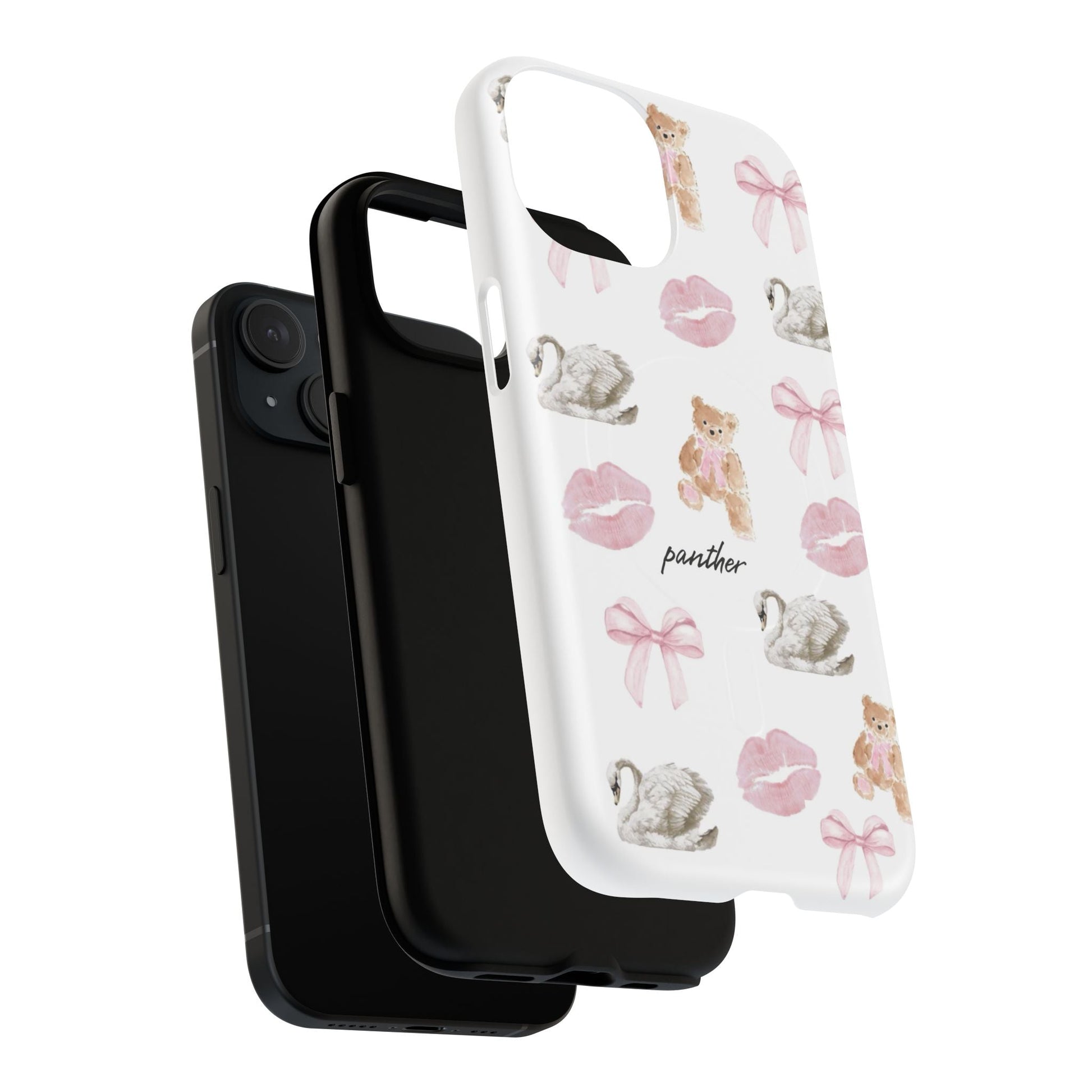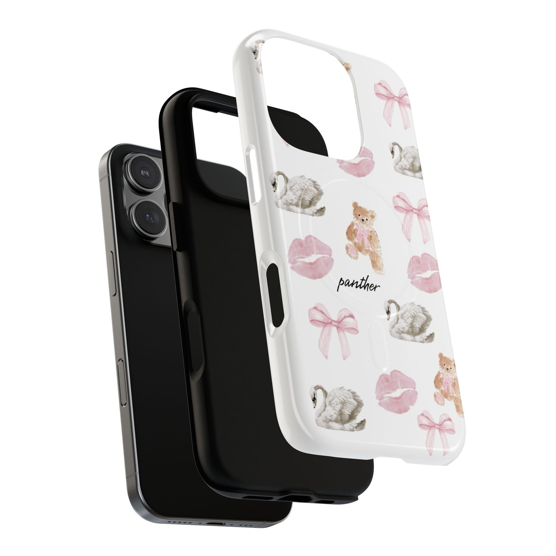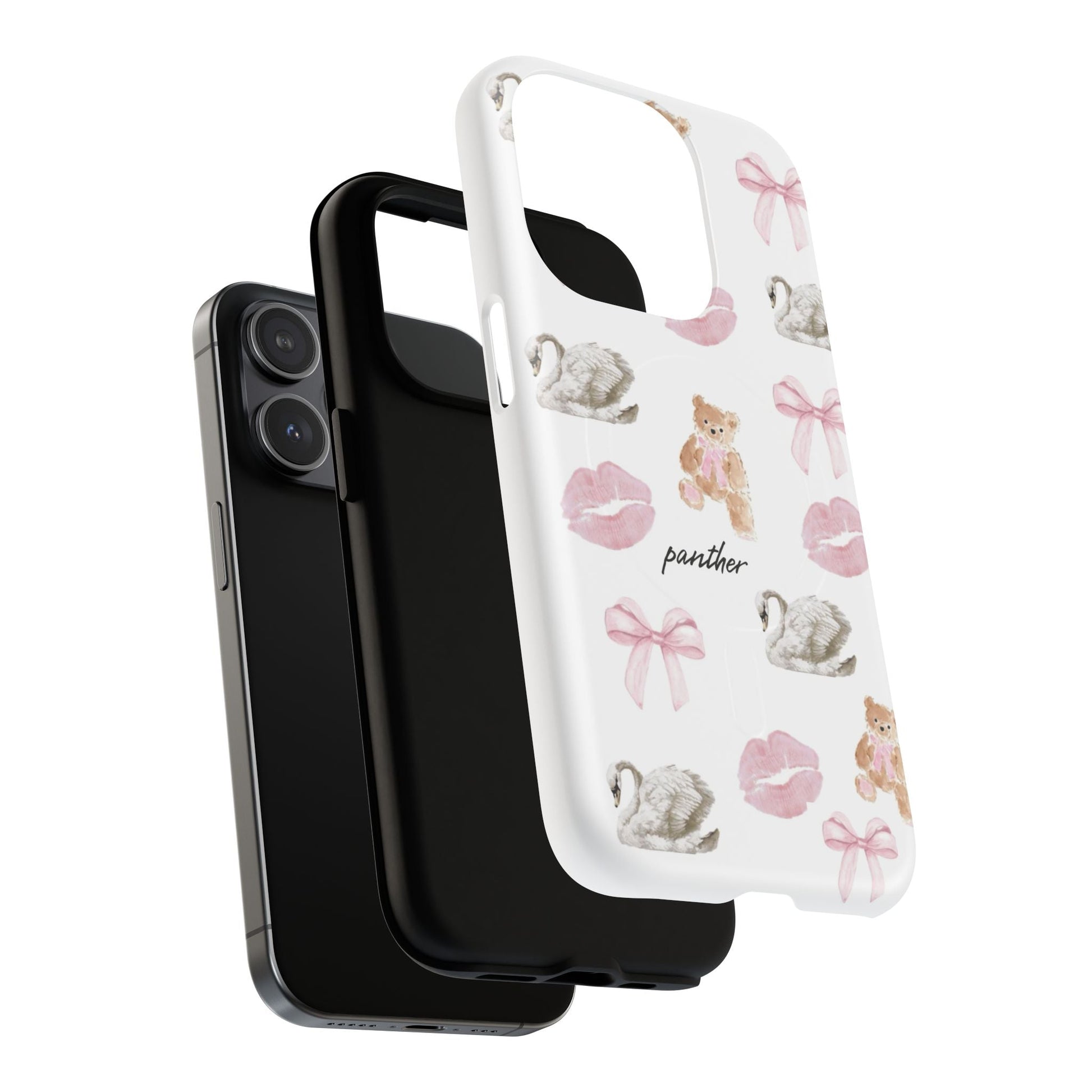 Designed with sophisticated bows, elegant bears, swans, and subtle pink kisses on a clean white background, this case blends charm with refinement, perfect for a chic, modern and clean aesthetic.