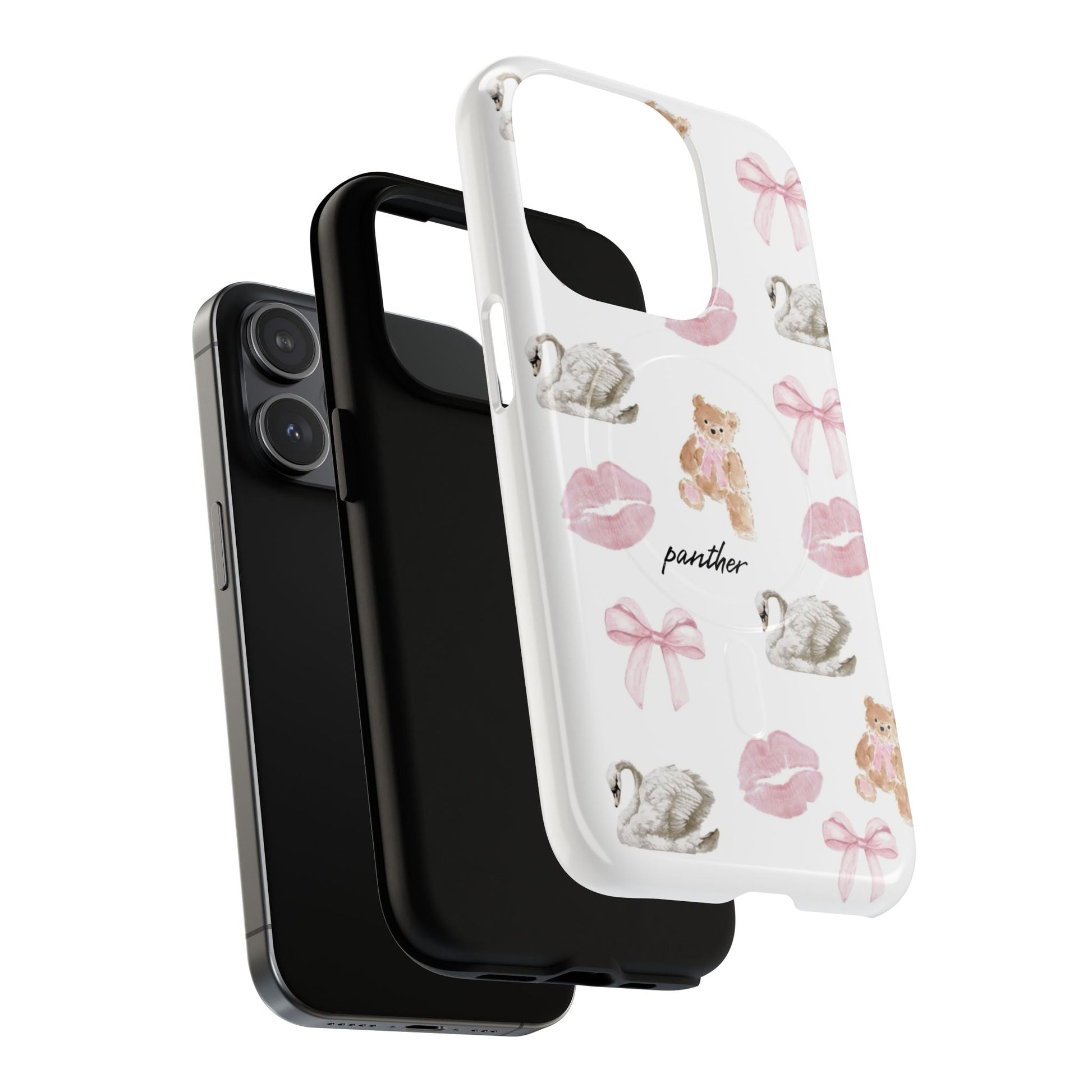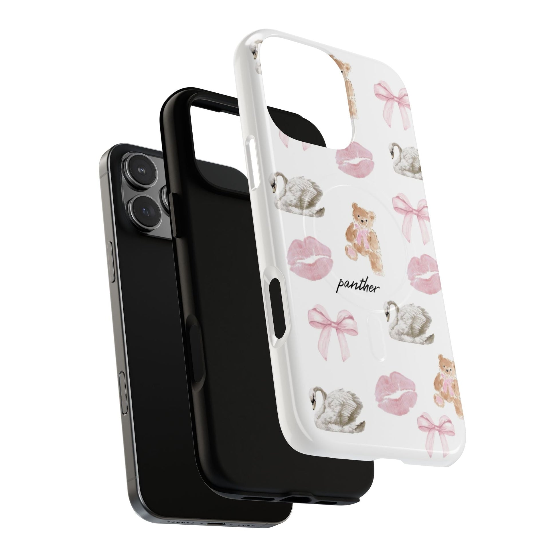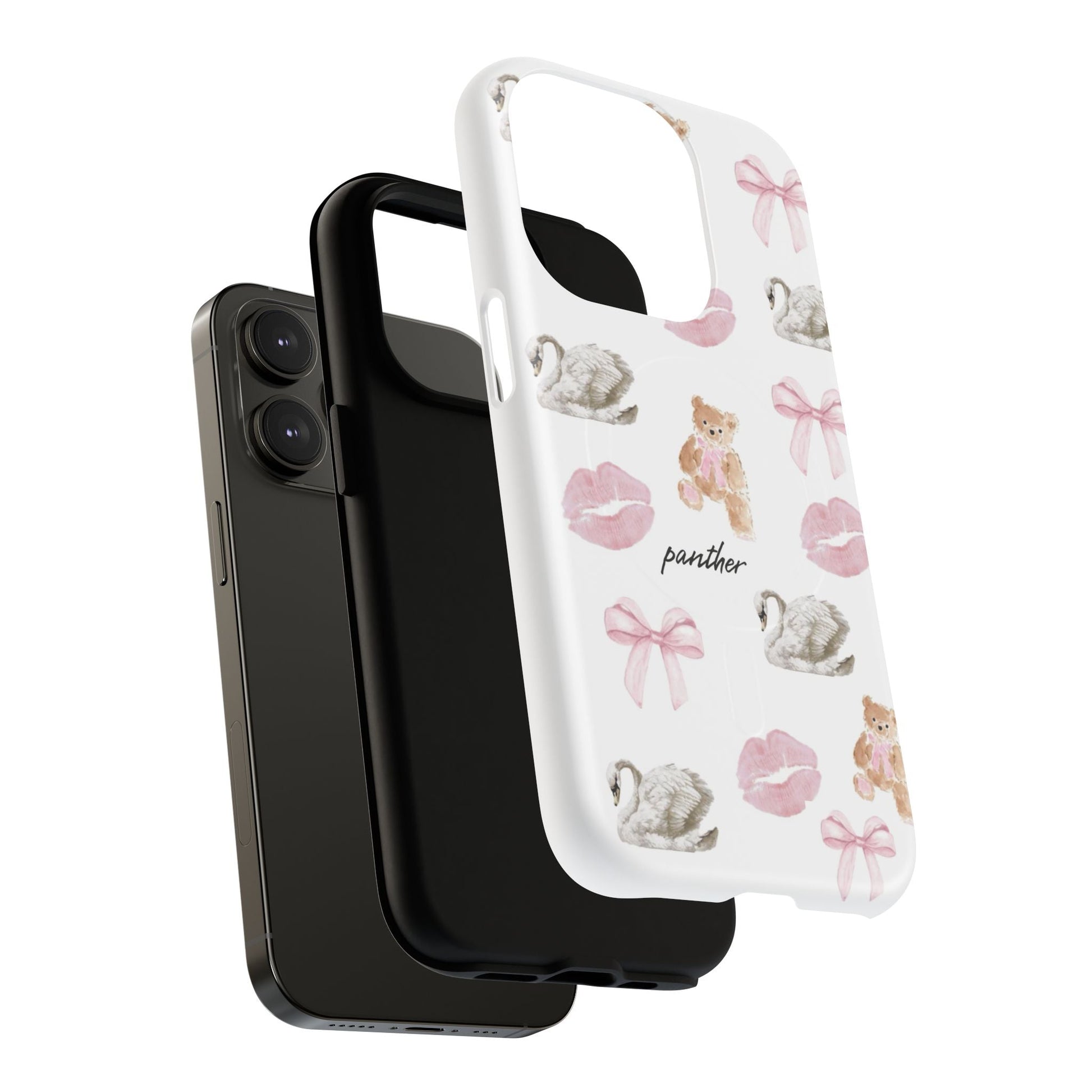 Designed with sophisticated bows, elegant bears, swans, and subtle pink kisses on a clean white background, this case blends charm with refinement, perfect for a chic, modern and clean aesthetic.